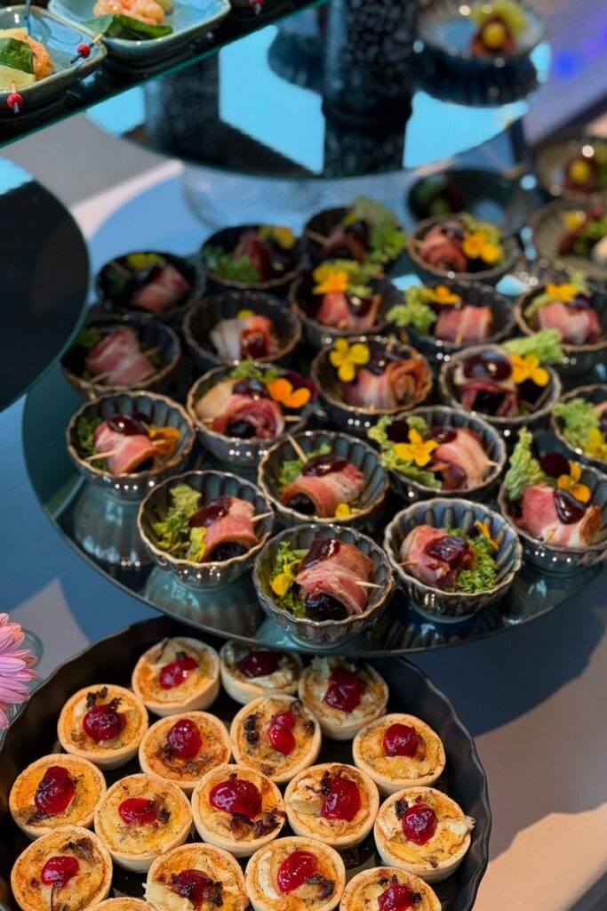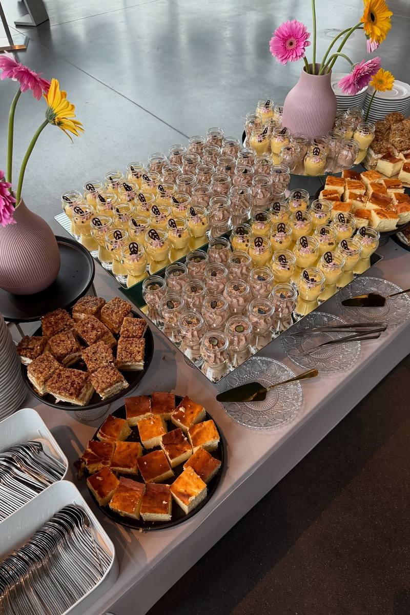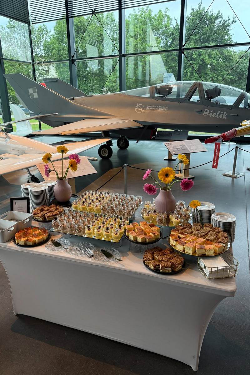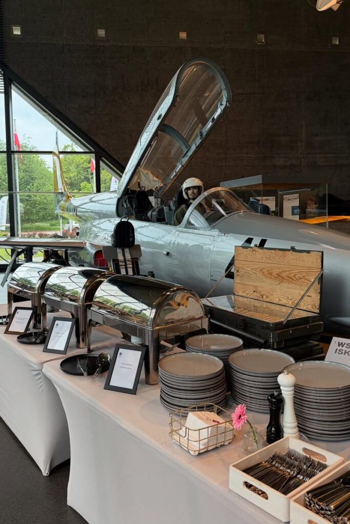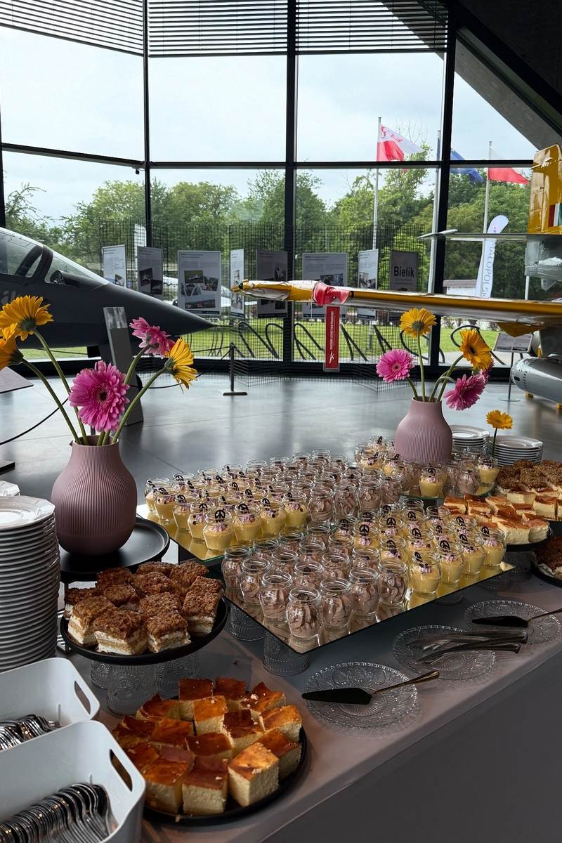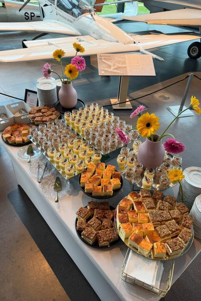 W otoczeniu historycznych samolotów zaserwowaliśmy różnorodny bufet, dopasowany do charakteru wydarzenia. Na uczestników czekały wykwintne przekąski, słodkie desery w eleganckich słoiczkach, a także klasyczne ciasta i wypieki. Całość dopełniała starannie przygotowana strefa z daniami na ciepło, serwowanymi w eleganckiej oprawie bufetowej.
